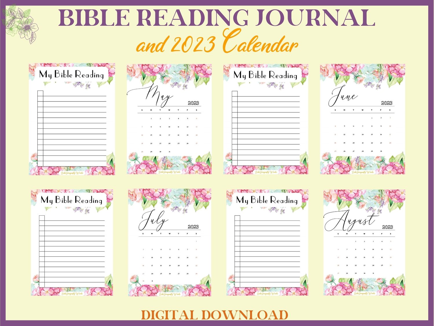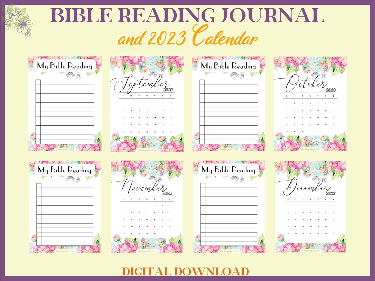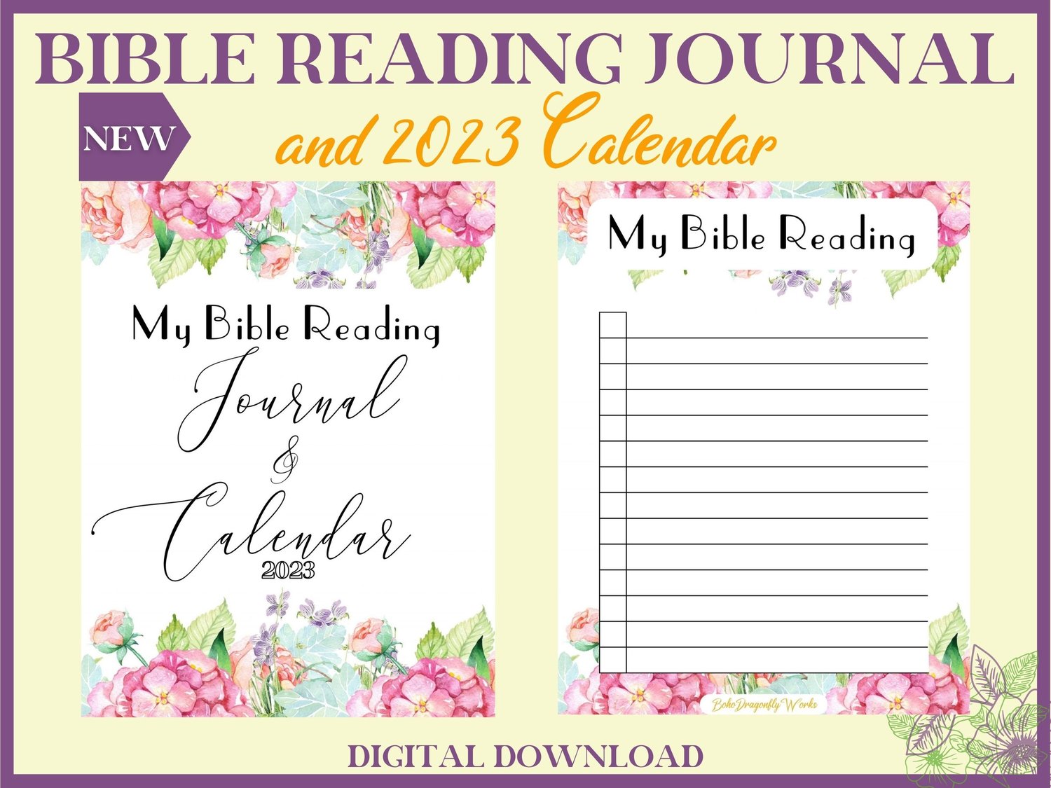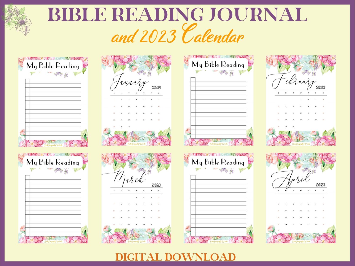 Floral Bible Reading Journal & 2023 Calendar Printable PDF for women. A simple journal for study, meditation.